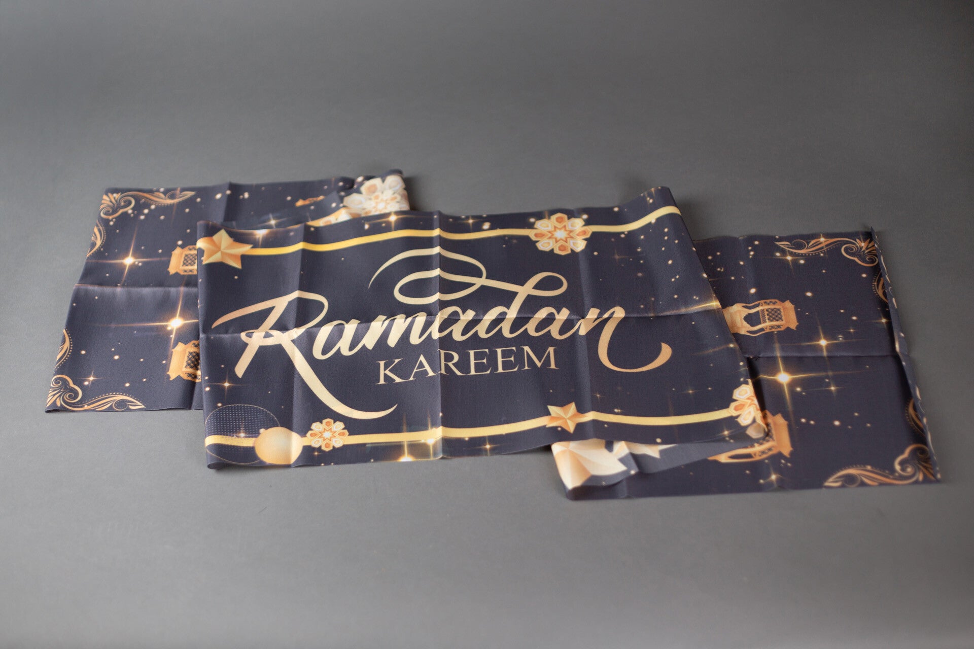 Breng sfeer en warmte aan tafel met deze prachtige decoratieve tafelloper “Ramadan Kareem”. De diepe donkere kleur met gouden details en fonkelende accenten zorgt voor een stijlvolle en feestelijke uitstraling tijdens de heilige maand.